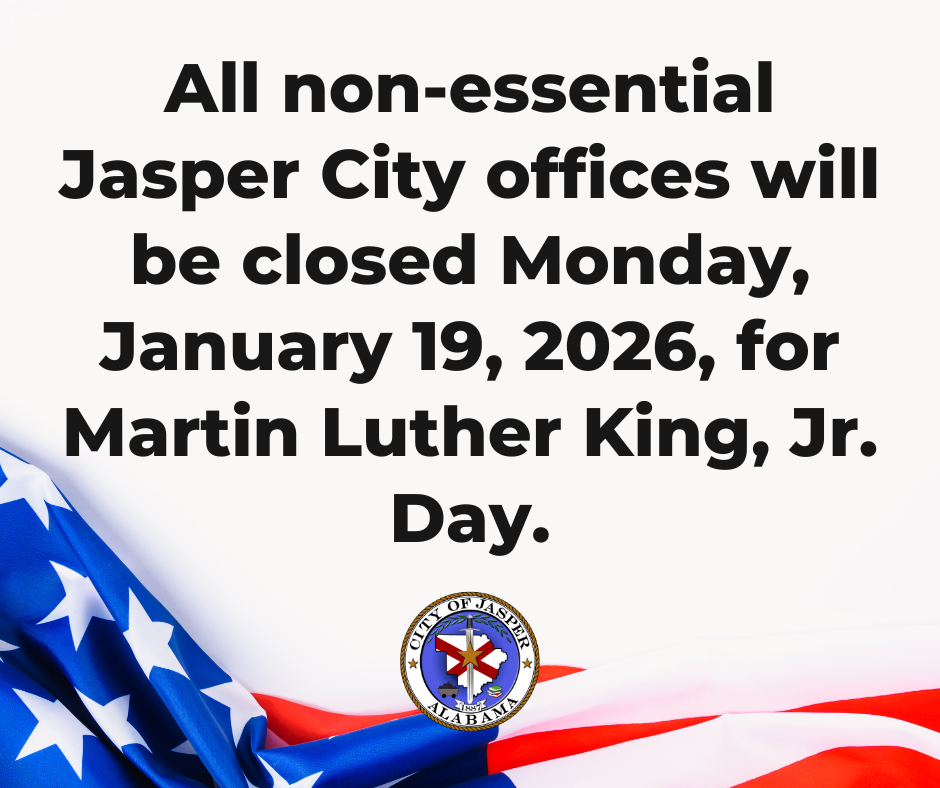 There will be no Jasper garbage collection on Monday, January 19 due to the Martin Luther King Jr. Day holiday. All pickups will be delayed by one day beginning with the regular Monday pickups occurring on Tuesday.