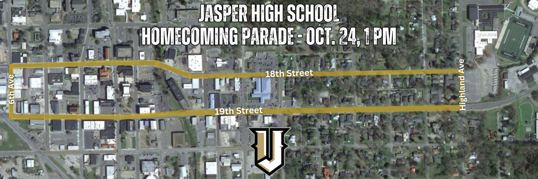 JASPER HIGH SCHOOL HOMECOMING PARADE - The Jasper High School Homecoming parade will be Friday afternoon, October 24, 2025. Temporary road blockages will begin at approximately 12:30 pm with the parade set to begin at 1:00 pm. Expect brief road closures at various points along the parade route from approximately 12:30 pm – 2:30 pm to accommodate this event. The parade route will be the same as in years past. GO VIKES!
