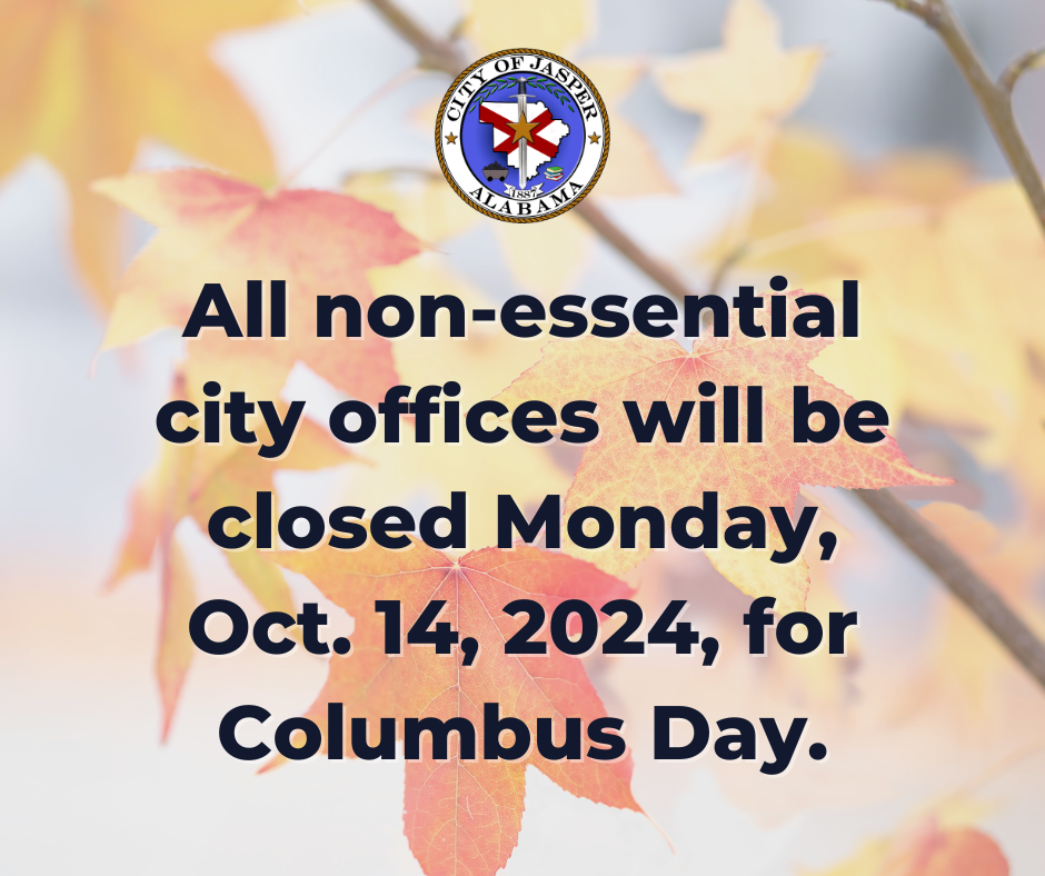 October 10, 2024 - There will be no Jasper garbage/debris collection on Monday, October 14, 2024, due to the Columbus Day holiday. Collection through the week will be delayed by one day beginning with the regular Monday pickups occurring on Tuesday.