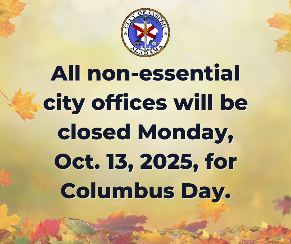 There will be no Jasper garbage/debris collection on Monday, October 13, 2025, due to the Columbus Day holiday. Collection through the week will be delayed by one day beginning with the regular Monday pickups occurring on Tuesday.